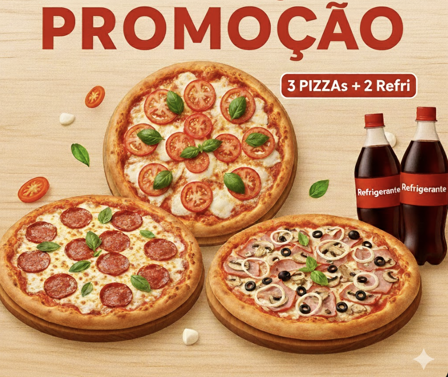 03 Pizzas Gigantes + 3 Refrigerantes 2 Litros